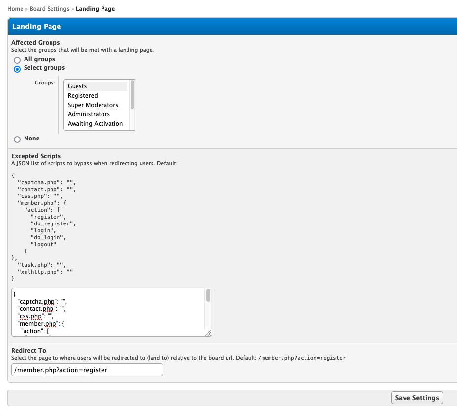 Introducing OUGC Landing Page by OUGC.Network, a plugin that lets you guide specific user groups to unique pages and offers the flexibility to skip redirects for chosen bypass scripts. Whether you want to force registration, share exclusive content, or important updates, this plugin empowers you to create tailored interactions for different users.