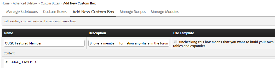 - Go to `Home » Advanced Sidebox » Custom Boxes » Add New Custom Box` to add a custom ASB box.