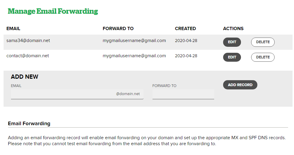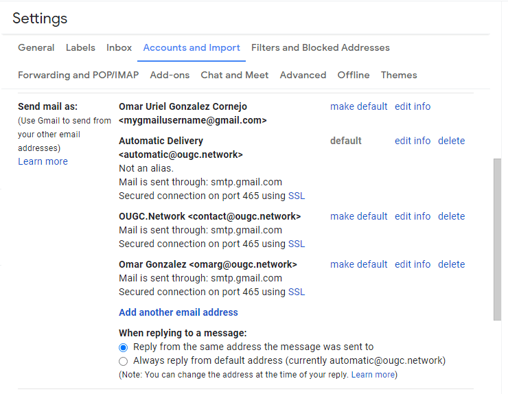 In the image above you can see I created two mail redirects, one for `contact@ougc.network` and other for `omarg@ougc.network`, but I also created one for setting up `automatic@ougc.network` and removed it after finishing the whole process. This is so I can send mails using `automatic@ougc.network` but it will stop people from replying to them directly.